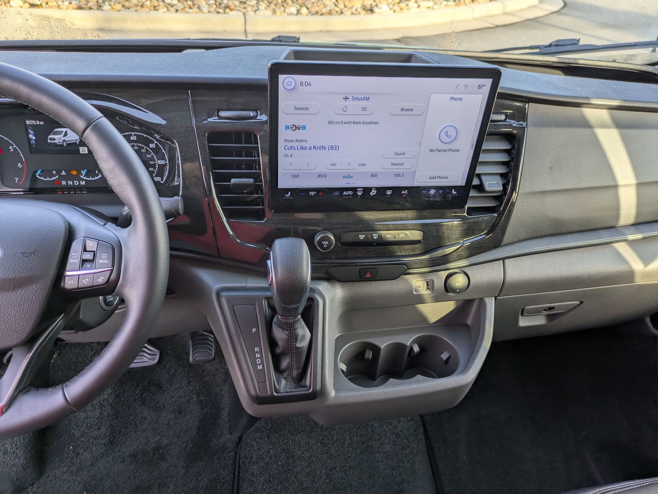 Convenience: Deep-tinted privacy glass with cloth shades, a center floor console with USB and 12V power, and double-stitched leather window valances.